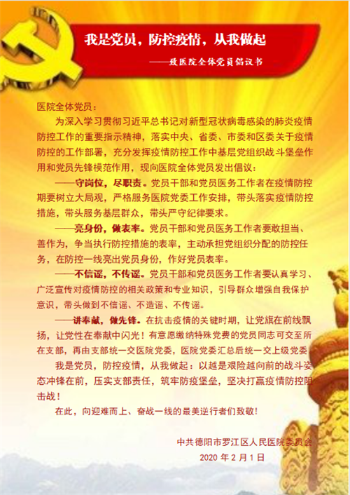 ? ? ? ?2月1日,在疫情防控的關(guān)鍵時(shí)刻,院黨委、行政向全院黨員干部職工發(fā)出倡議:號召廣大黨員干部職工提高政治站位,一切行動(dòng)聽指揮;積極踴躍報(bào)名,充實(shí)醫(yī)療小分隊(duì);堅(jiān)守本職工作,履行好崗位職責(zé)。